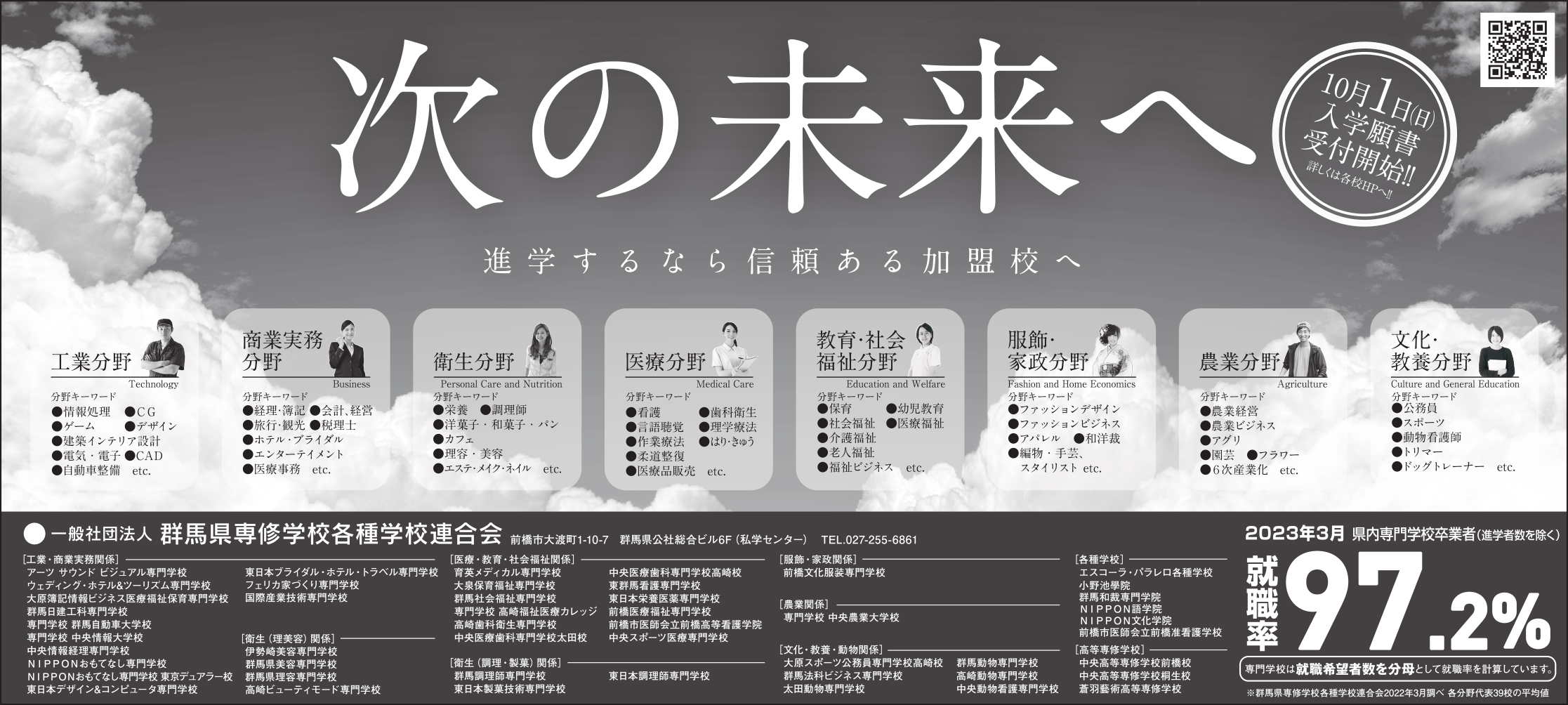 2023.09.6 広報事業 9/2(土)の上毛新聞に群専各連の広告(第3回目)が掲載されました。 R5年度の就職率を掲載した第3回目の新聞広告が9/2(土)の上毛新聞に掲載されました。 第1回目・2回目同様、地域面(県央面)下部に掲載されています。 10/1(日)以降、一般入試の入学願書受付が開始となります。